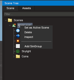 The Coins will show up in the Scene Tree, group them inside a SimGroup called Coins, right click the level object and select Add SimGroup: